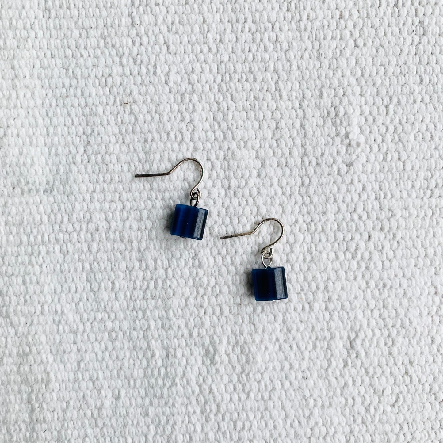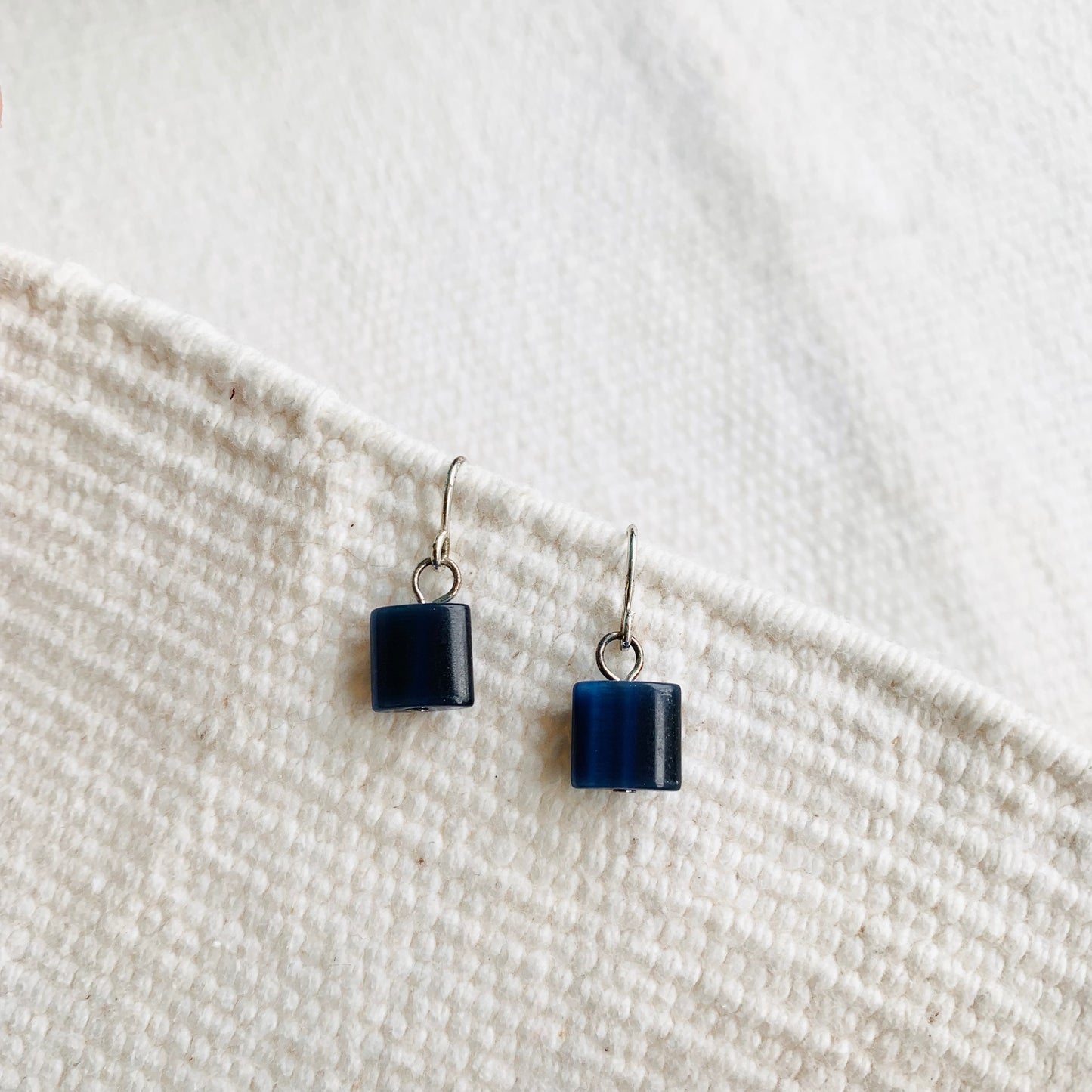Perfect little rounded square dangle earrings in a deep but light catching midnight blue. Like dark tanzanite. Restrained, elegant, and easy in such a compelling colour.
