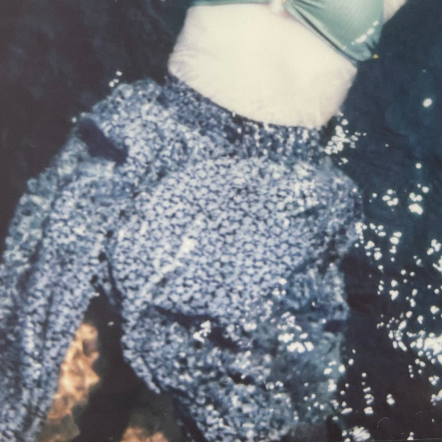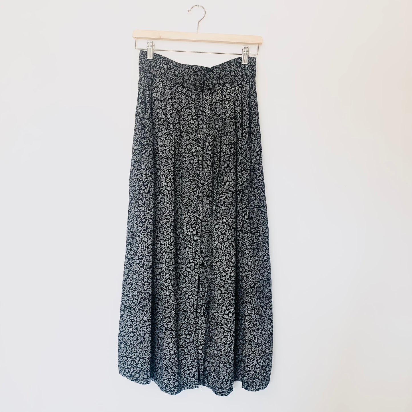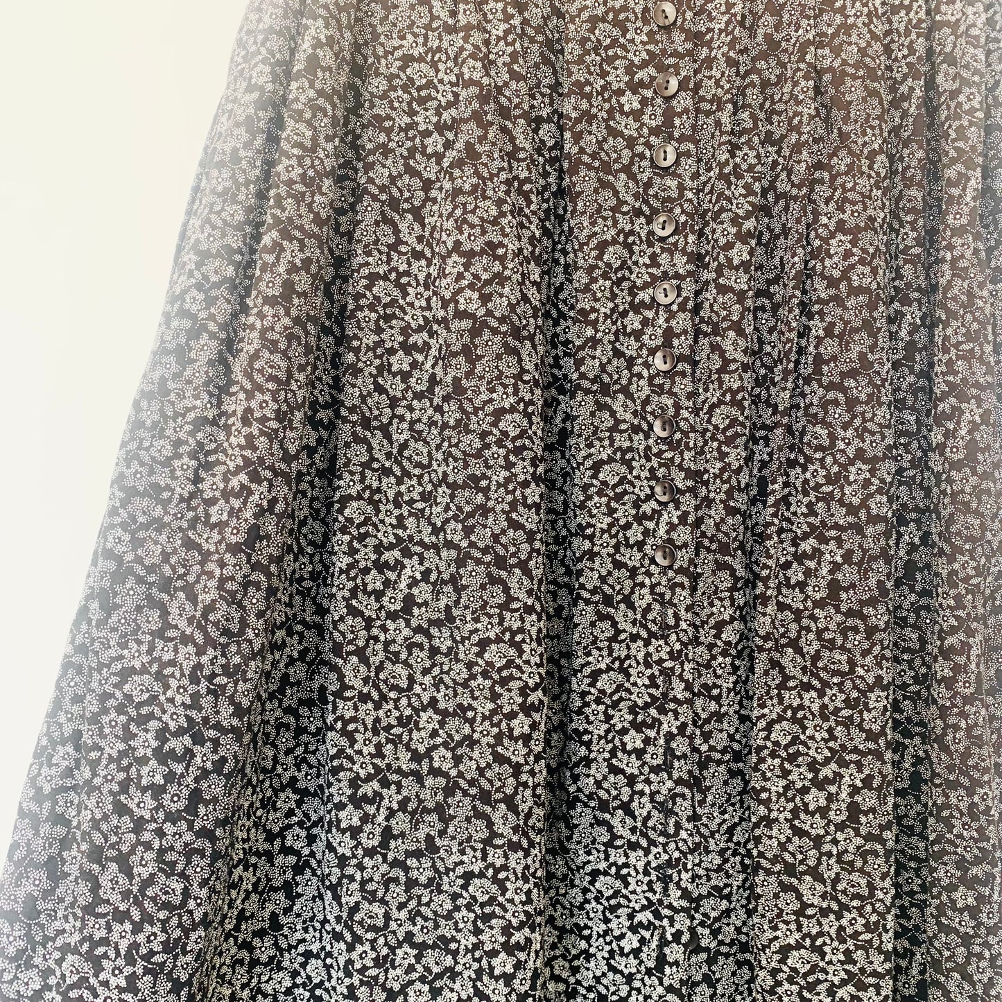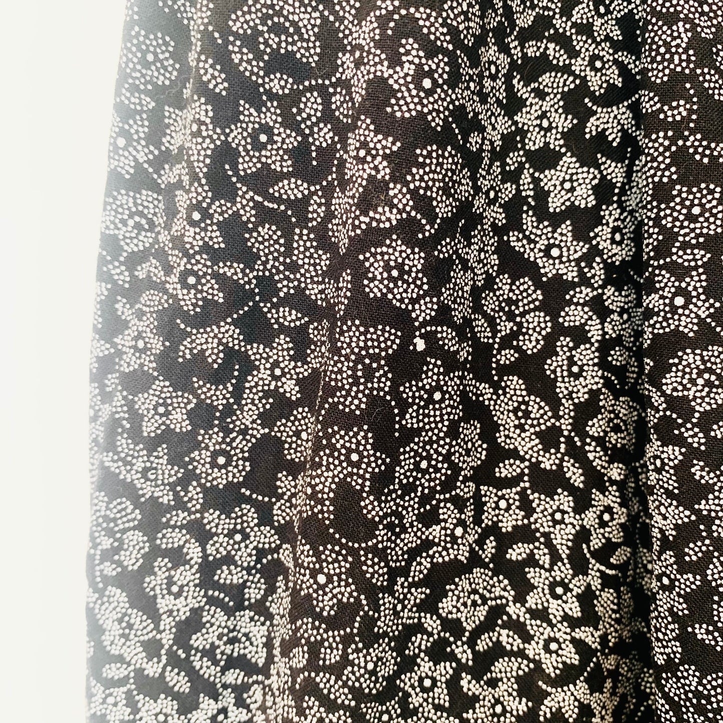 Romantic wide band, full black cotton pleated skirt with pockets and buttons from the waistband to the hem. Wonderful scale, and a beautiful printed pattern of vines and five petal flowers that feel like a hand poked tattoo.