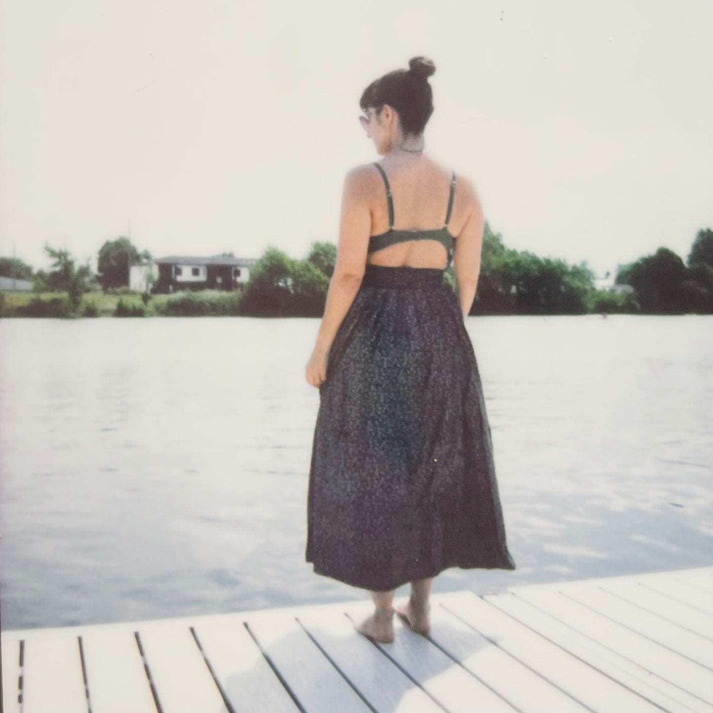 Structure in the waistband and fullness in the skirt creates a corset-like effect.